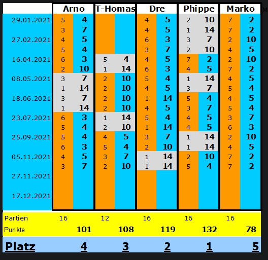 Der buy-in ist pro Abend 20.- sFr. (10.- pro Partie)
